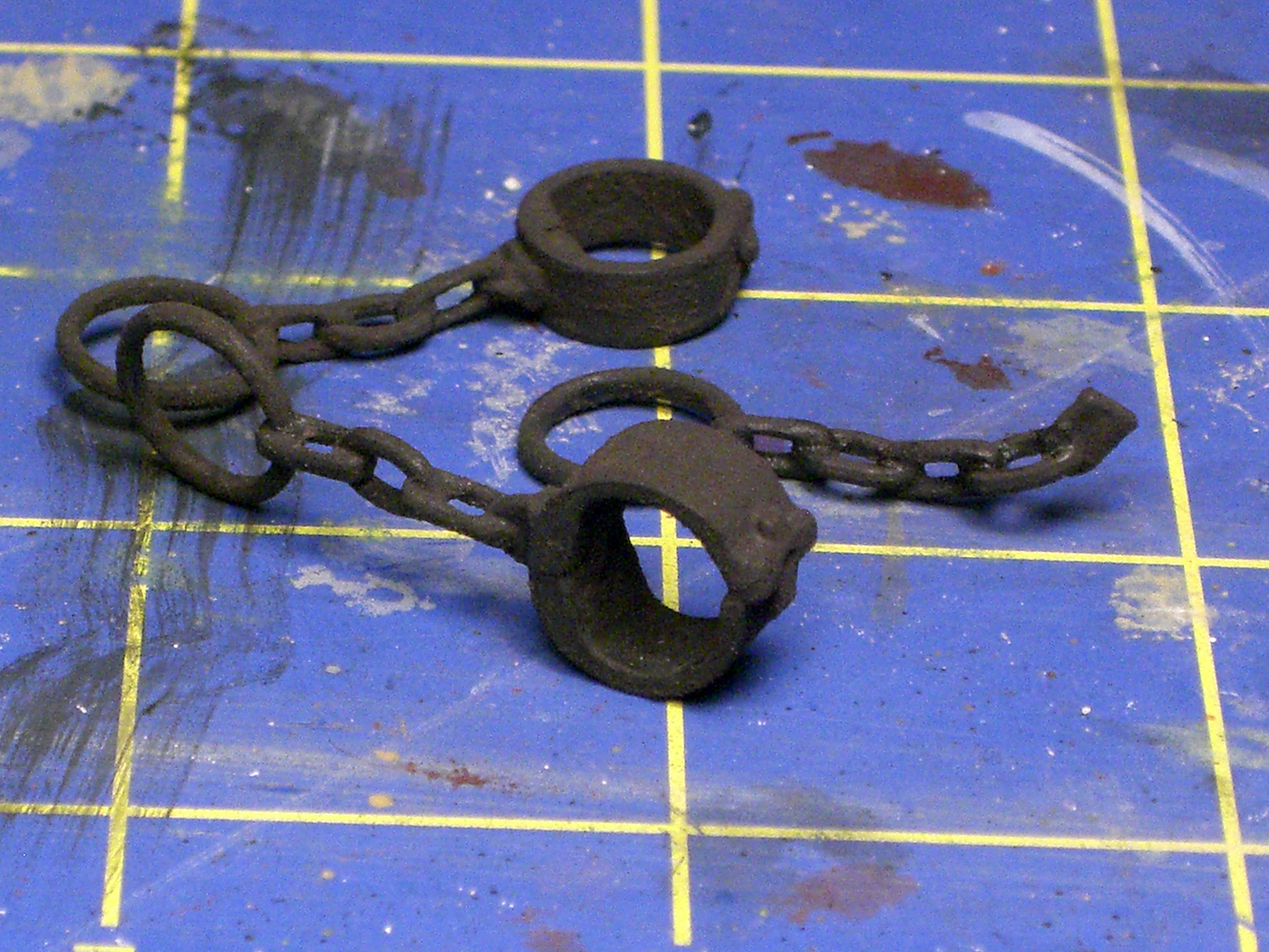 Citadel also has an amazing glaze specifically meant to simulate metal corrosion. It's simple to use and terrific looking when dry. I simply brushed it on over the steel paint I used on the chains and manacles. It not only colors but adds some textural elements to roughen up the surface of what's being painted. Oh, I should say here that I did do some extra detailing on the chains, also. For some reason, the chains alternate between open links and solid ovals. I don't know if this was a molding issue or what, but I never liked the way it looked, so I carved out the solid oval shapes to look like chain links. It was a bit tedious, but looks so much better, I think.
